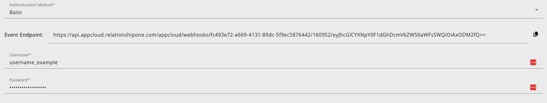 Basic: provide a username and password. Click the Get Event Endpoint button to generate an event-specific endpoint. You can update the Username and Password values as long as the transaction event is disabled.