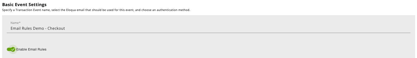 First, give your event a name. Next, for simple configurations, search for the Eloqua email asset that should be used when sending a transactional email message. Optionally, enable Email Rules to associate the event with multiple emails that are intelligently used based upon rules you configure later. For more information, see Email Rules. Then, set enabled or disabled send options as desired.