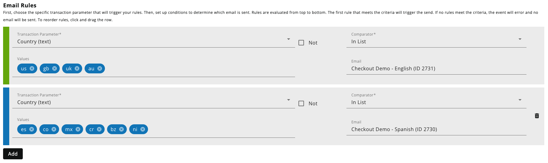 If you enabled Email Rules in Step 1, you must now configure them. Email rules use JSON data to determine which email to send, which is especially useful for supporting multiple languages or sub-brands under a single event configuration.