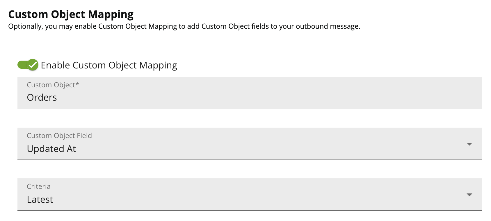Optionally, enable Custom Object mapping to add fields from a Custom Object. To enable, toggle on the 'Enable Custom Object Mapping' toggle. Then, select your Eloqua Custom Object. Finally, select how the app should select the correct record if there are more than one mapped to a contact. The fields from the Contact Object will be available to personalize your text message in step 3.