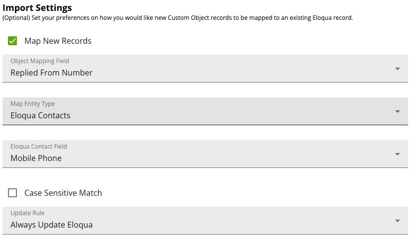 - Set your preference on how new Custom Object records should be connected (mapped) to an existing Eloqua Contact or Account record. Typically, this is the phone number for mapping a record to an Eloqua Contact and an Account ID for Account connections. Optionally, you can change the update rule that should be applied to loading data into Eloqua.