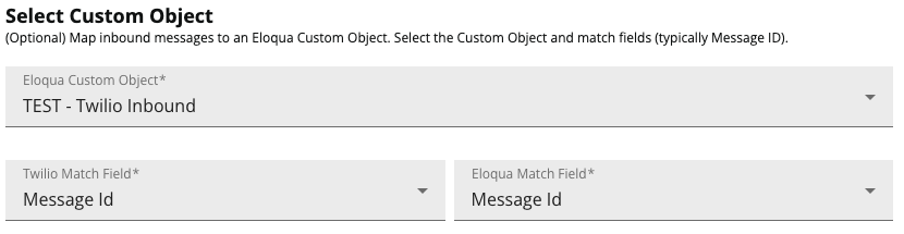 - Select an Eloqua Custom Object to save all inbound reply messages. You will need to decide what Custom Object field should be used as the unique identifier and its matching Twilio field. If your Custom Object is capturing messages from multiple text campaigns, that is, a single mobile phone number will be sent more than one message, it's recommended that you use the Message Id as the unique identifier.