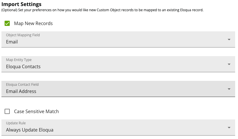- Set your preference on how new Custom Object records should be connected (mapped) to an existing Eloqua Contact or Account record. Typically, this is the email address for mapping a record to an Eloqua Contact and an Account ID for Account connections. Optionally, you can change the update rule that should be applied to loading data into Eloqua.