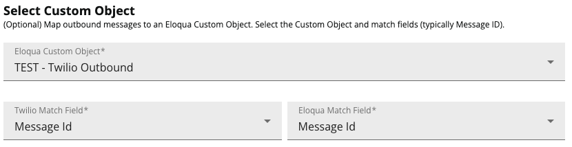 - Select an Eloqua Custom Object to save all outbound messages. You will need to decide what Custom Object field should be used as the unique identifier and its matching Twilio field. If your Custom Object is capturing messages from multiple text campaigns, that is, a single mobile phone number will be sent more than one message, it's recommended that you use the Message Id as the unique identifier.